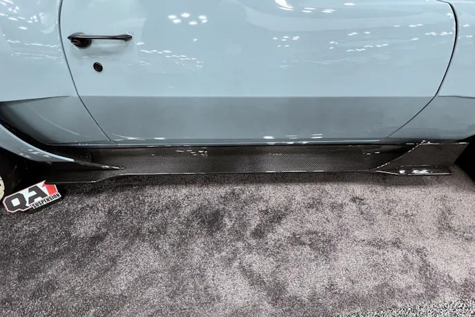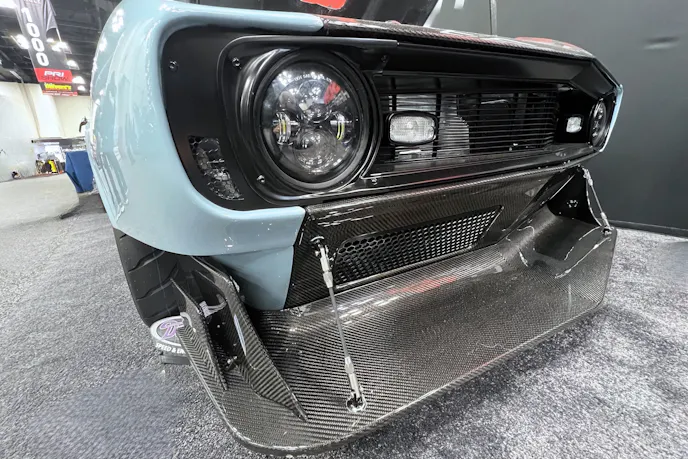 The front end is completely carbon fiber. Auto Metal Direct (AMD) donated all new body panels to replace the dilapidated sheetmetal. The front fenders were sliced and widened and used to make carbon fiber molds. Obviously, the hood, splitter and spats are all carbon fiber.