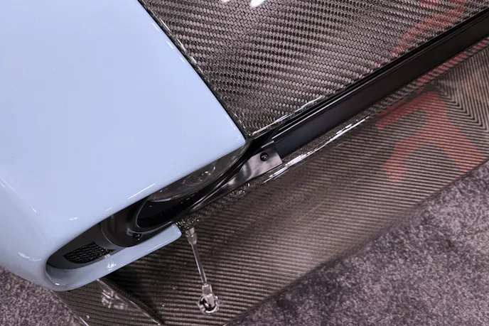 The rear diffuser and decklid are carbon fiber, so too are the side skirts and rear spats. The doors were supposed to be carbon fiber, but they simply ran out of time, so they’re steel. All in, Darwish says the lightweight body panels removed about 600 pounds from the vehicle.