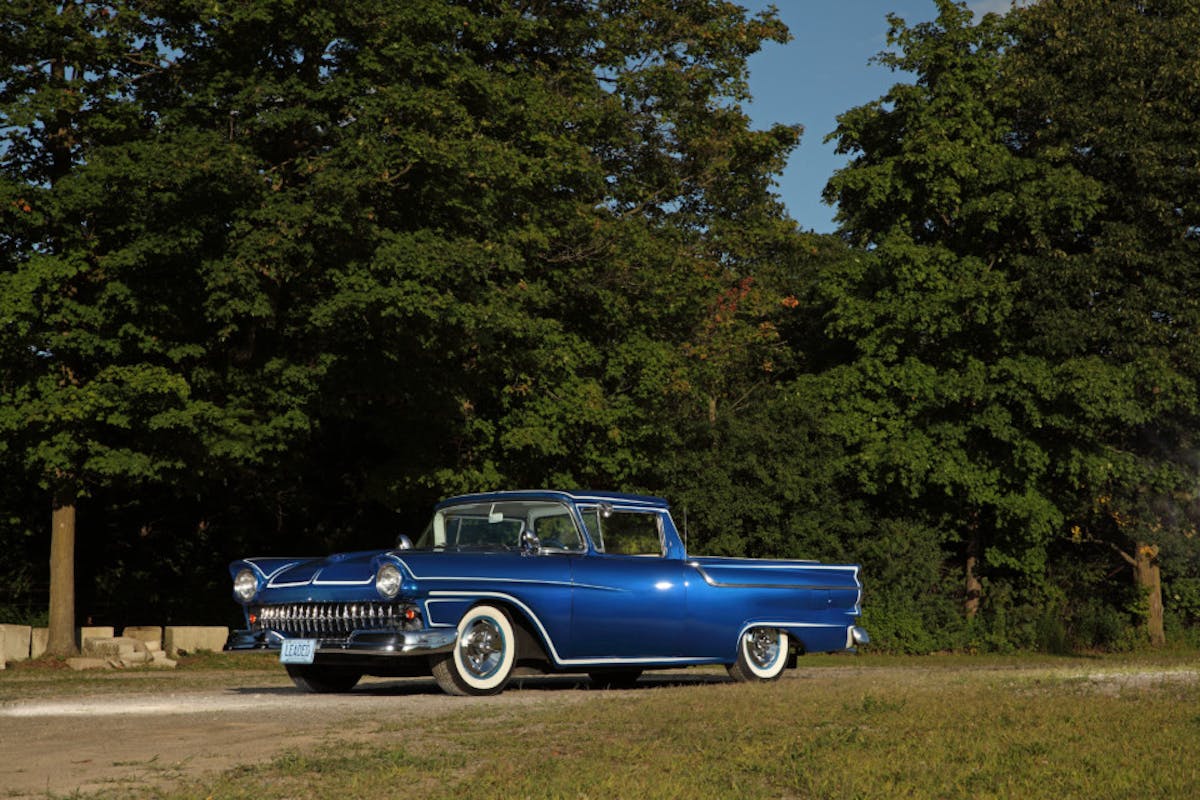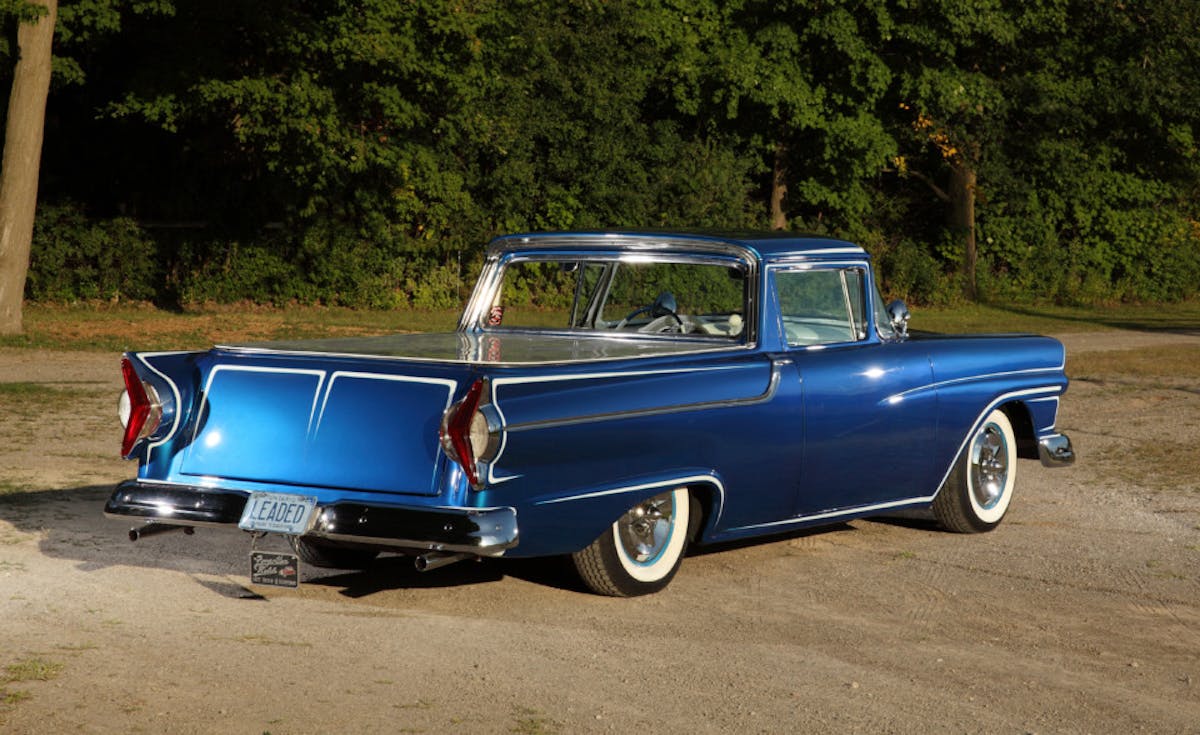 Edsel never had an equivalent Ranchero, but Ford did offer a wagon that shared certain trim with the ill-fated brand. Incorporating ’58 Edsel Villager taillamps was a clever and very effective trick. Quarter-panel top edges where raised 3/8-inch to make the transition to the Edsel lights flow smoothly. Stock ’57 Ranchero bumpers where retained, but the OEM guards were removed and smoothed to clean up the bumper lines.