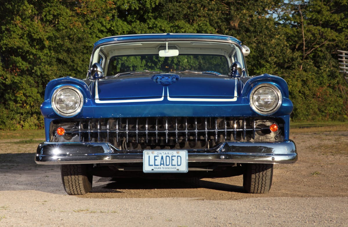 The list of mods is extensive, so let’s take it from the top. The fenders have been mildly peaked and headlights recessed using ’56 Mercury pickup bezels with the grille opening molded to a lower valance. From there a ’55 ‘Vette grille is widened by six extra teeth, and a center bar is extended the same length. Early ’70’s Harley taillights as turn signals are anchored to the grille ends, keeping the horizontal flow across the front end clean.