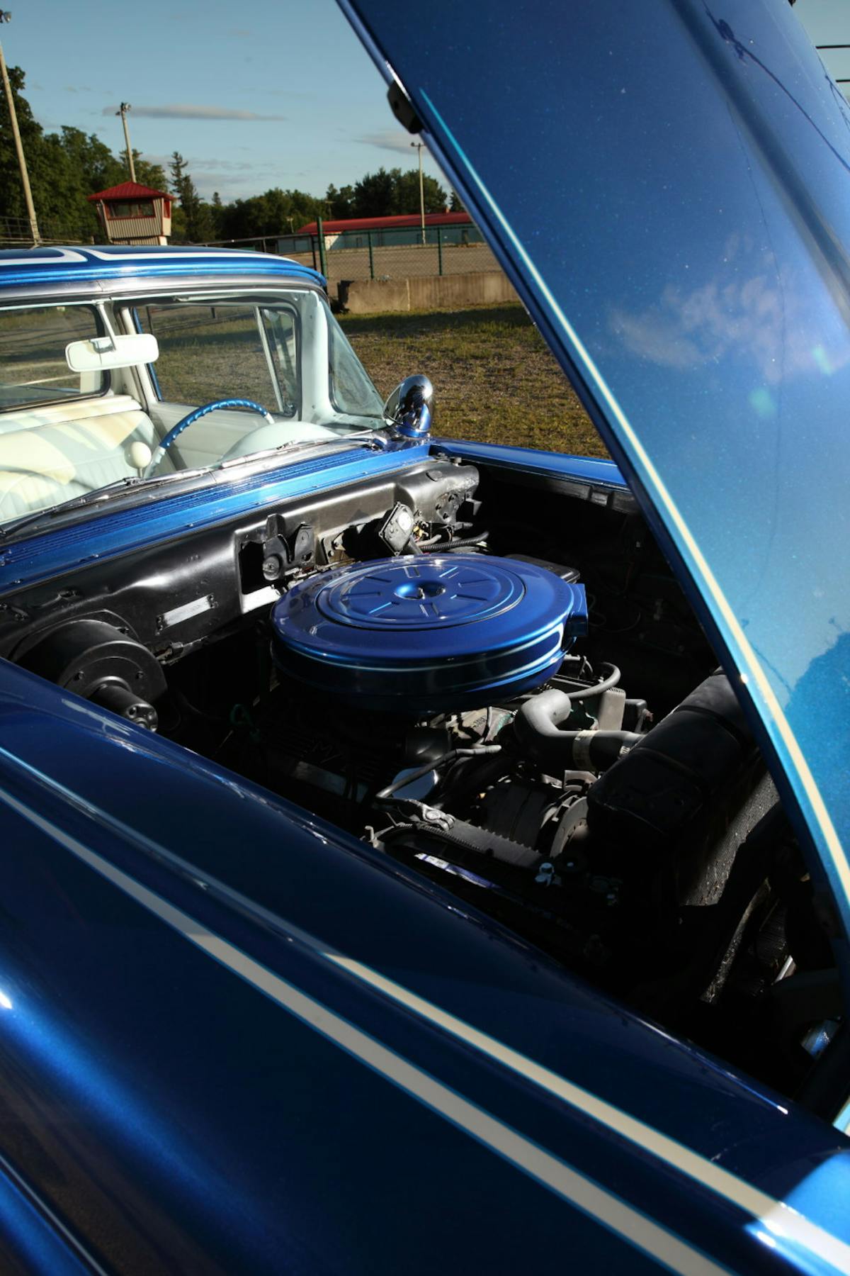 The rear axle is the original 9-inch that came in the car some 60-years ago with gearing that makes it a sweet highway cruiser. Rear springs are Posie Super Glides de-arched 3 inches with Teflon inserts. Shocks at both ends are KYB gas units to smooth out the ride.