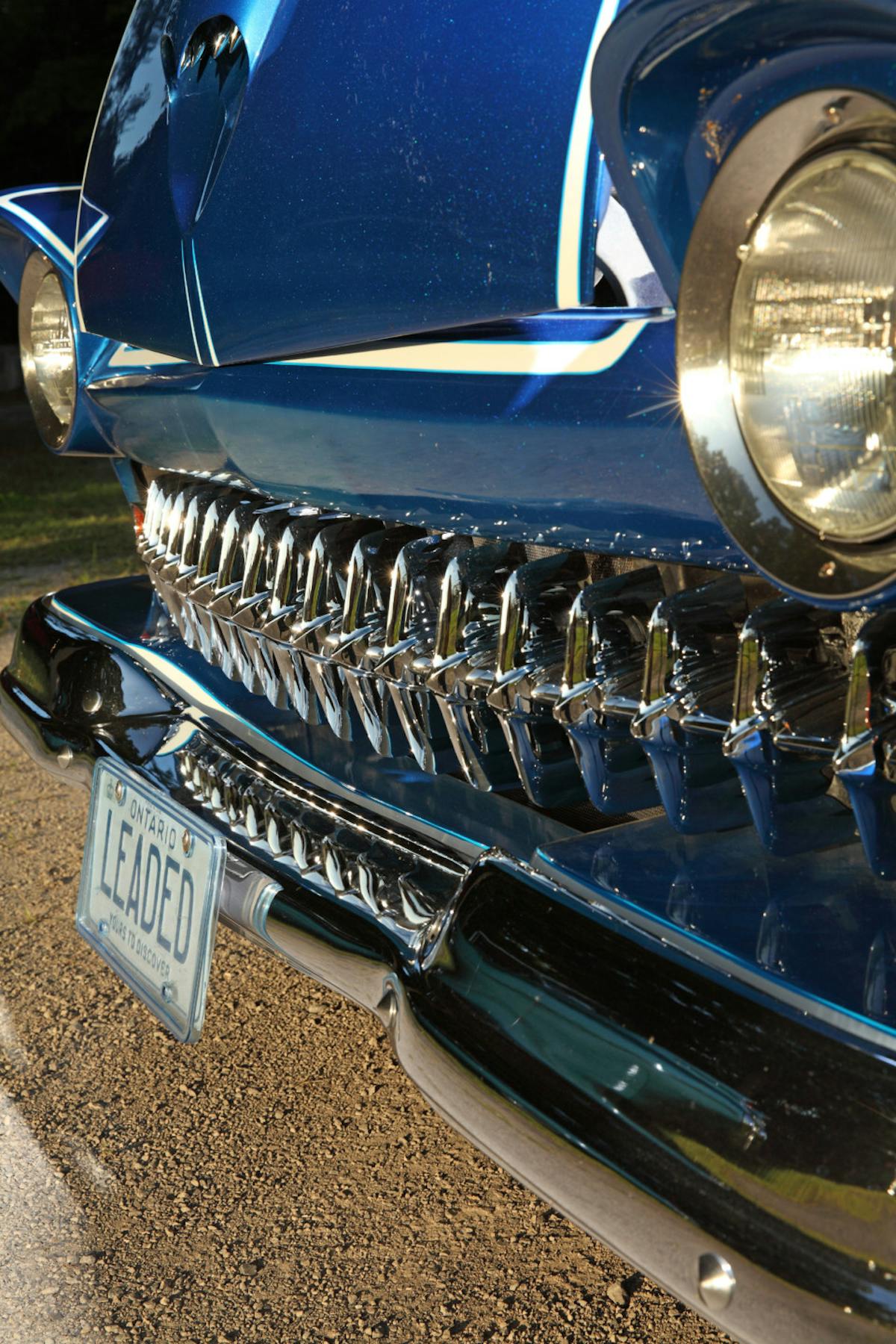 Sparks tells us, “My painter (Dean Dillon of Professional Collision Clinic, Oshawa, Ontario) and I got busy on the project, and in six months it went to Dean’s shop for the new colors and scallops. The combination draws a lot of interest as it re-kindles the early Kustom era so prominent in the So Cal area in the late-’50s and early-’60s. All scallops have been pinstriped in a light blue by one of Canada’s legends, Mr. Rollie Guertin.”