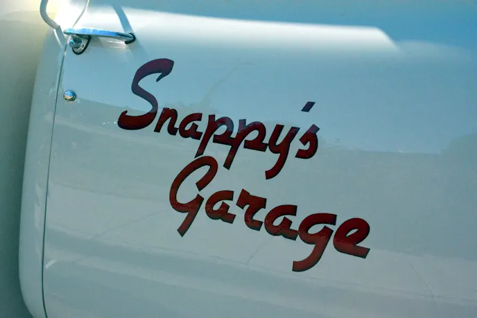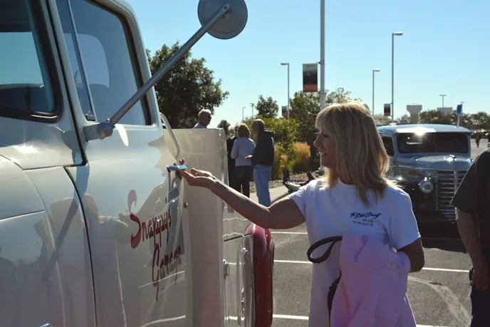 “We are walking along and I see a nice truck and said, what is that?,” Suzy recalls of that day. “It was a Diamond T – very nice. So we get up to it and I get distracted by a truck that looks like the truck we are building and it had the same paint scheme. So now I’m thinking, what in the world, how could someone have the same exact idea? What are we going to do? We need to tell Jimmy and switch some stuff up. Right about that time I saw the door, which says ‘Snappy’s Garage’ and realized THIS WAS OUR TRUCK!”
