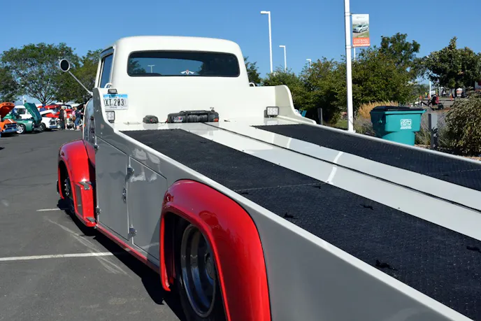 Constructed atop a donor chassis, which came out of a 1993 Snap-On Tools truck, the COE is equipped with a Reyco Granning air suspension system with Ridetech bags up front. This combination allows the truck to be “laid out” to a more suitable stance. After all, both of the Stuchels’ current customs ride relatively low to the ground, and the COE had to fit in. Plus, it makes loading either of the couple’s classics onto the back of the hauler a bit more convenient.