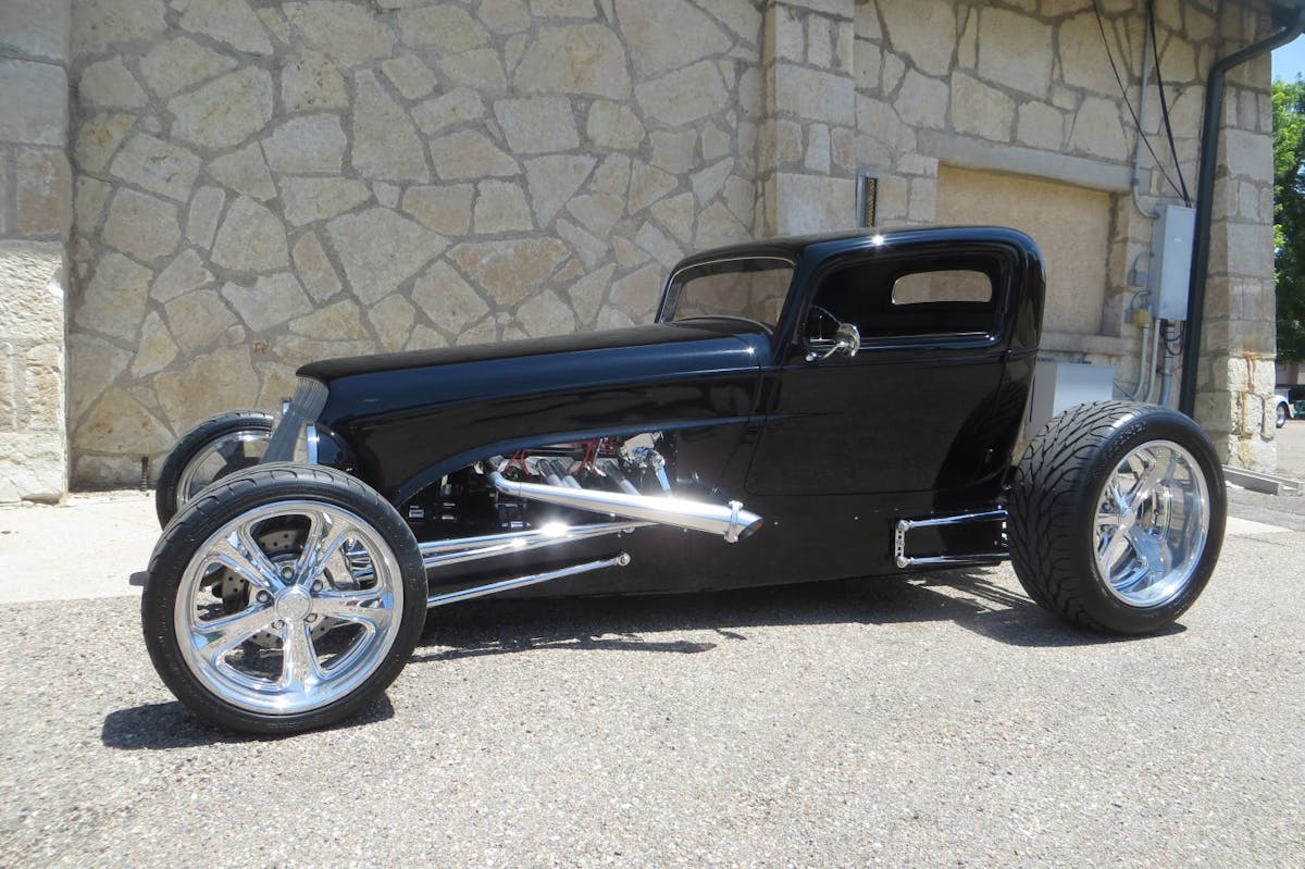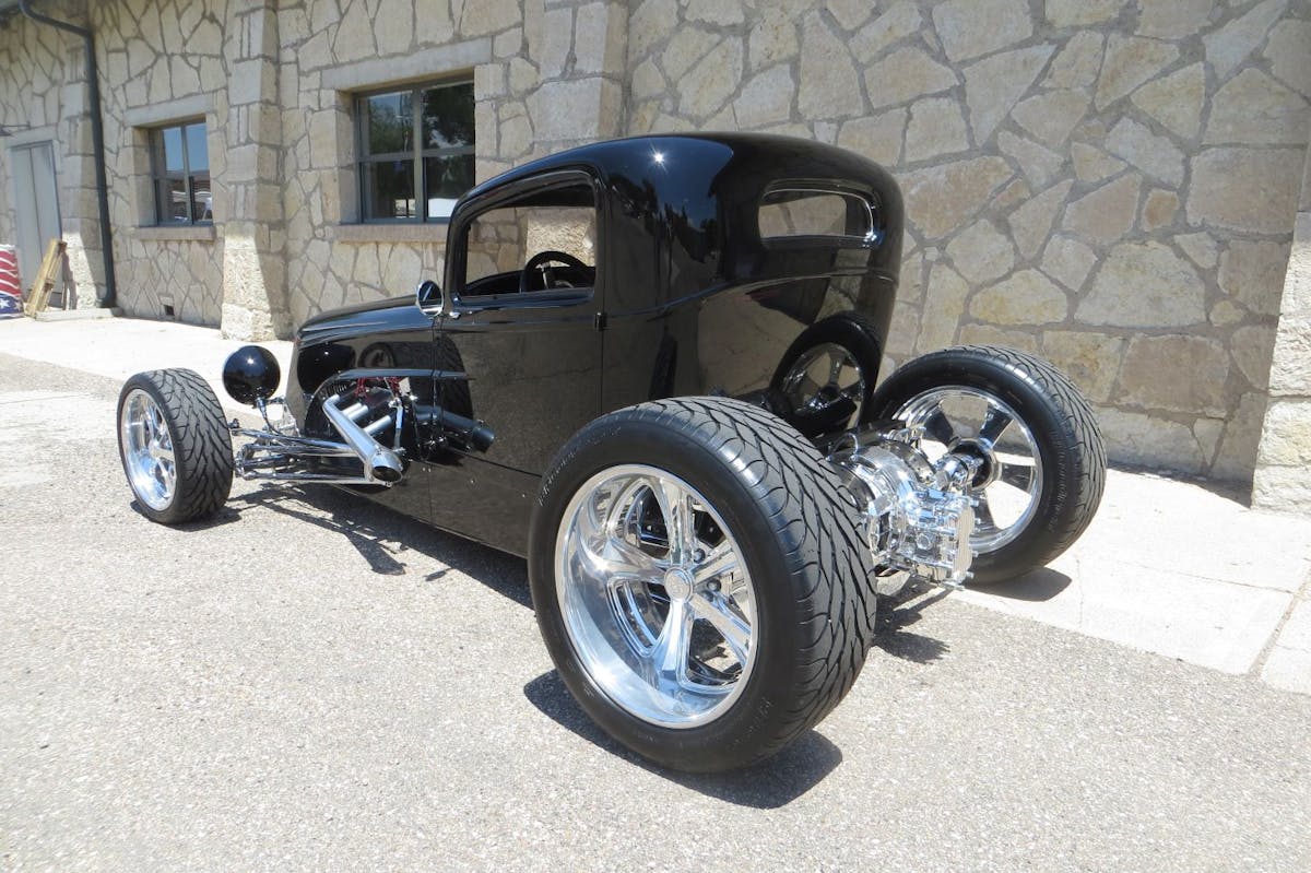 Inside the coupe, a Hot Rods by Dean gauge panel was added to the dash and filled with Classic Instruments Tetra Series 3-gauge set. The Vintage Air Streamline A/C control unit has been placed directly below it. For shifting that T-350 transmission, a Lokar six-inch shifter sits center seat. The center console houses only power window switches. A chromed Motor State ididit shorty tilt-column and a banjo-style steering wheel finish it off.
