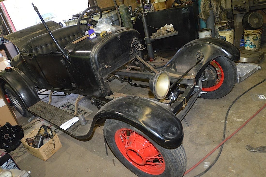 How many original Model T roadsters have you ever seen that weren’t in a museum? How many that still have what looks to be original paint, floors and trunk that’s not rotted? This car was sitting right next to the ’46 Chevy truck in the shop, the body had been pulled off the frame, and the frame is now sitting outside the shop. Pilkton and Whitehead have built a custom frame for the roadster, and it rides on a drop axle and flipped spring up front.