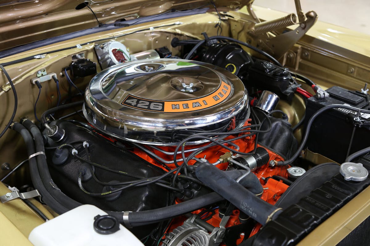 Also atypical was the fact that the Charger was only offered with V8 engines. They included a base 318 cubic-inch two-barrel, a 361 cubic-inch two-barrel, a four-barrel 383, and the new 426 cubic-inch Street Hemi, derived from the powerplant used in NASCAR racing. All were backed with a choice of a three-speed manual, a four-speed manual, or a TorqueFlite automatic.