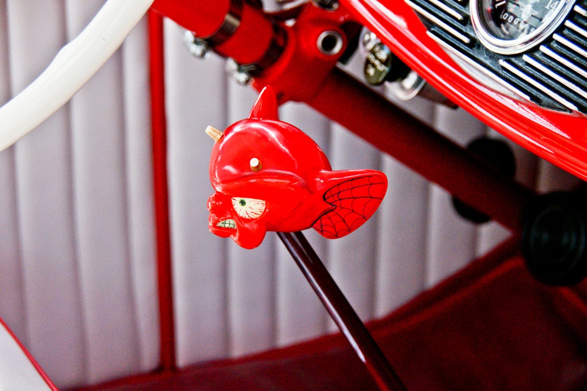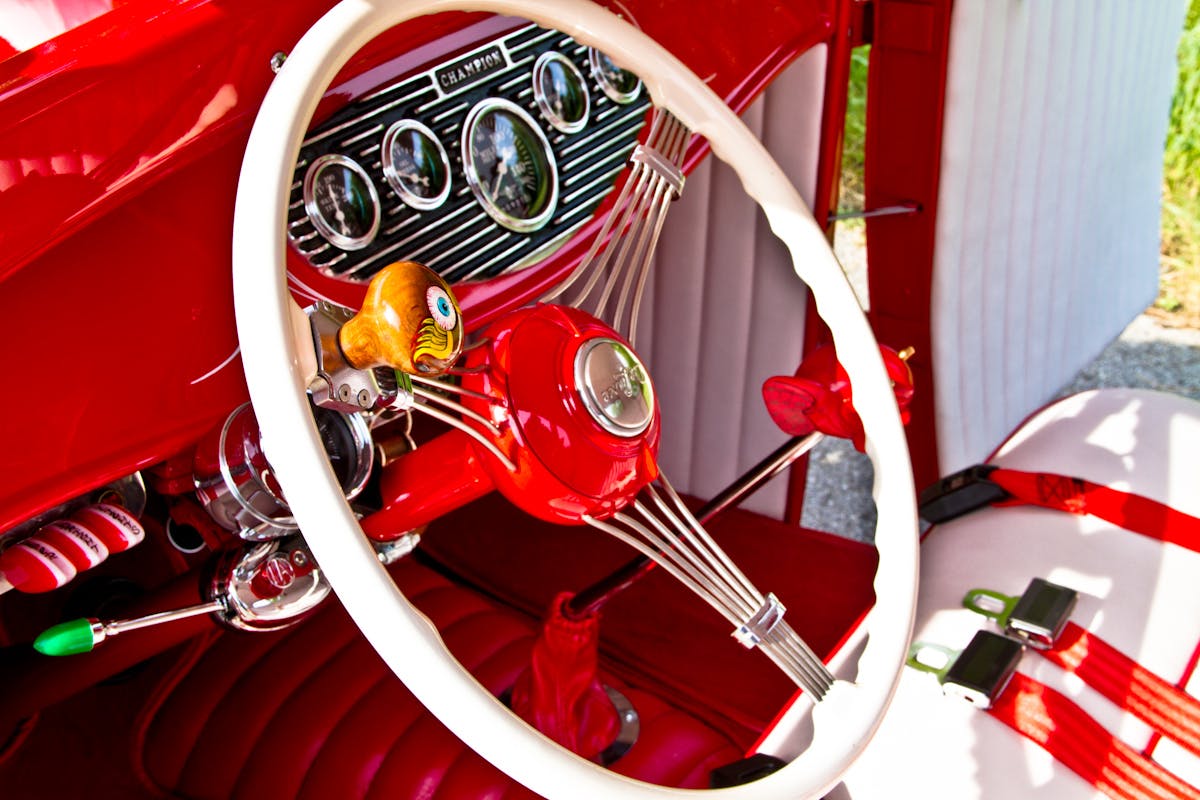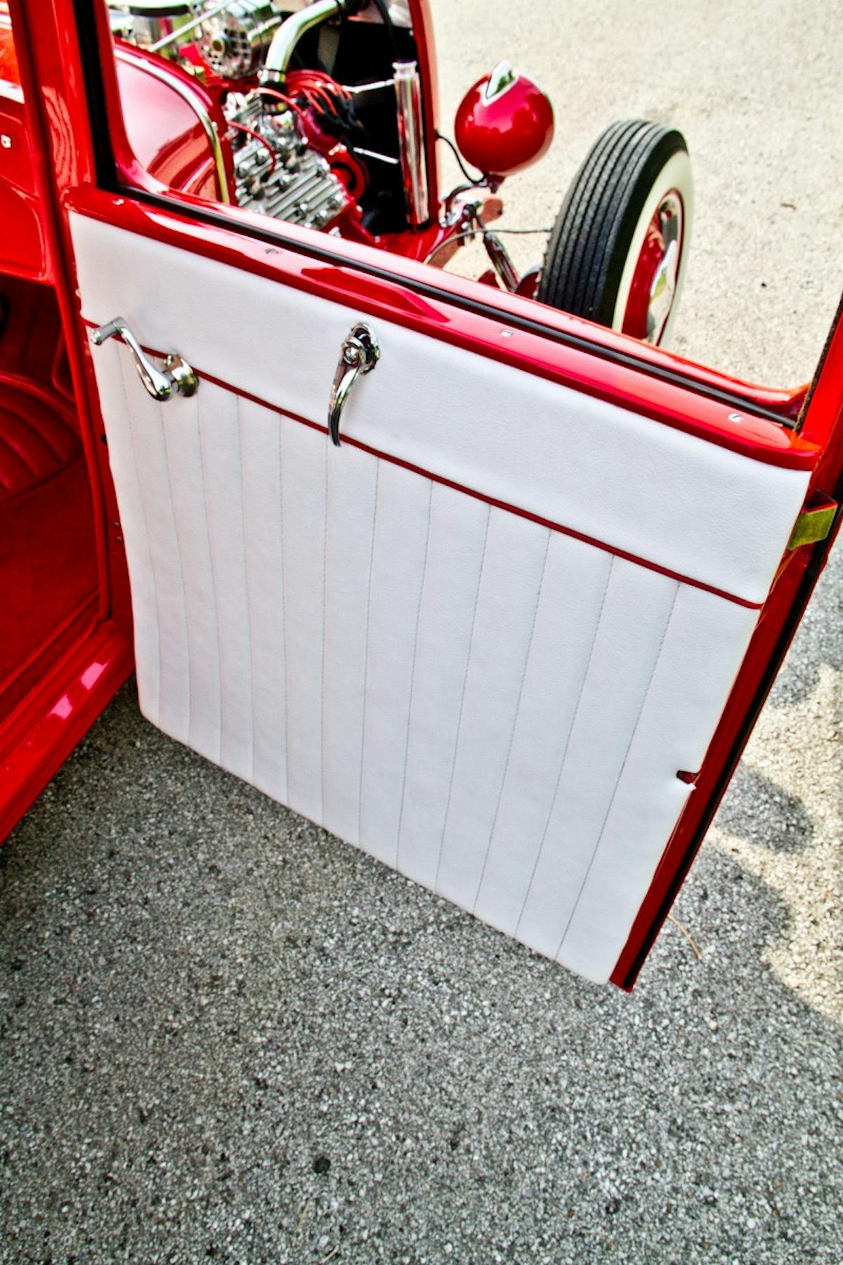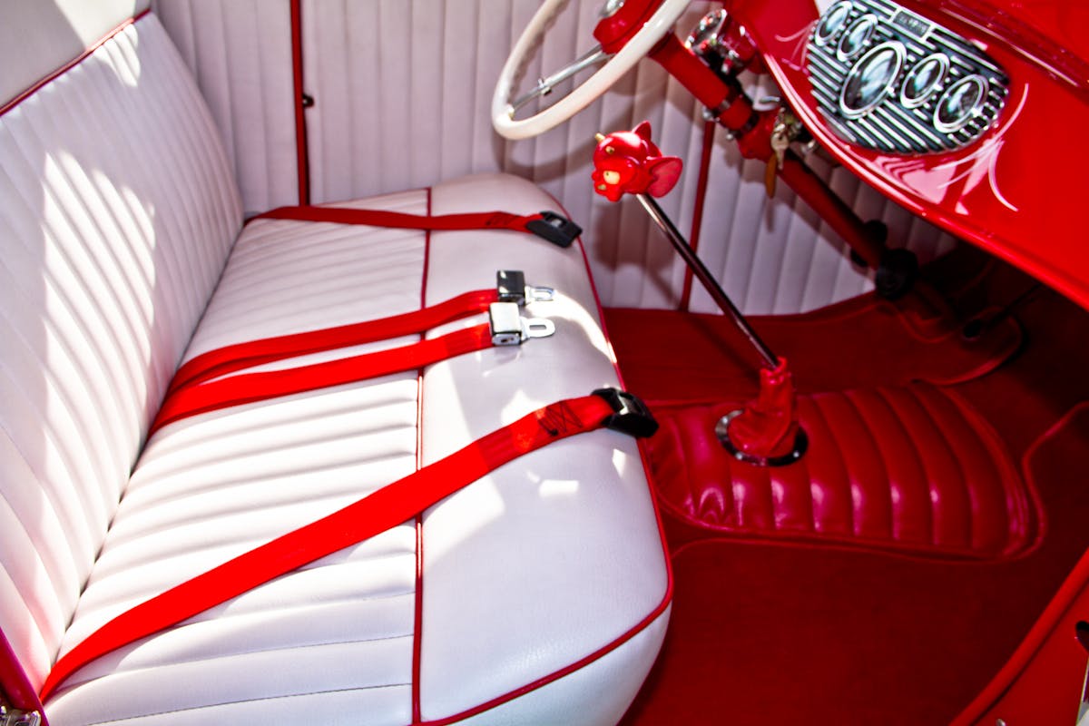 Komarek’s Upholstery in Great Bend, Kansas, was tasked with the interior stitch work which consists of tuck-n-rolled white vinyl with red-piping stretched over a Glide Engineering reclining bench seat, fitted with red Juliano’s seat belts, and the flooring was covered with red nylon plush cut carpet. The door panels, trunk area, and headliner all received the same tuck-n-roll white vinyl and red carpeting treatment. The in-cab electronics were setup with Affordable Street Rods wiring tucked behind a 1932 Ford dash with Stewart Warner Wings instrumentation. A 1939 Ford steering column topped off with a 1939 Ford banjo steering wheel, fitted with the iconic Von Dutch flying eyeball assist knob (painted by Pat Landsparger), and a devil “Brain” custom shifter knob, also painted by Pat, completes the interior.
