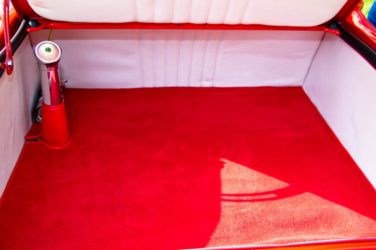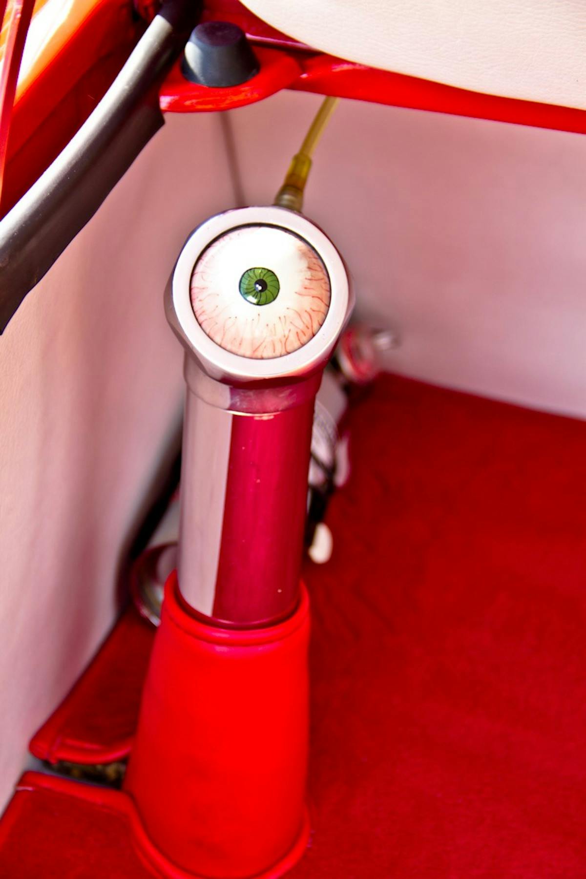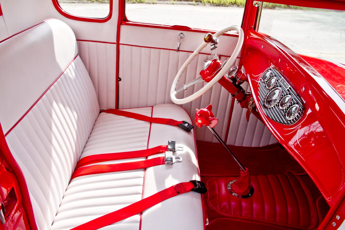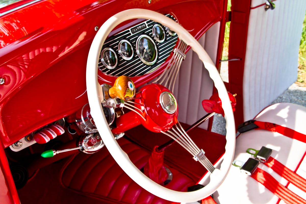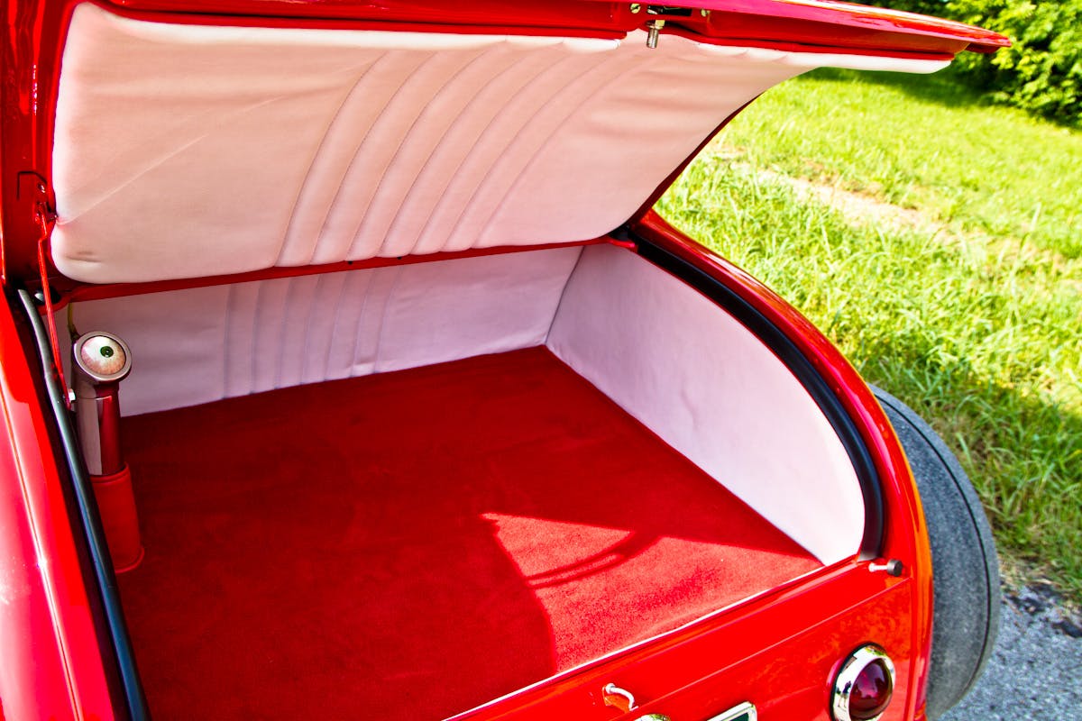 Komarek’s Upholstery in Great Bend, Kansas, was tasked with the interior stitch work which consists of tuck-n-rolled white vinyl with red-piping stretched over a Glide Engineering reclining bench seat, fitted with red Juliano’s seat belts, and the flooring was covered with red nylon plush cut carpet. The door panels, trunk area, and headliner all received the same tuck-n-roll white vinyl and red carpeting treatment. The in-cab electronics were setup with Affordable Street Rods wiring tucked behind a 1932 Ford dash with Stewart Warner Wings instrumentation. A 1939 Ford steering column topped off with a 1939 Ford banjo steering wheel, fitted with the iconic Von Dutch flying eyeball assist knob (painted by Pat Landsparger), and a devil “Brain” custom shifter knob, also painted by Pat, completes the interior.