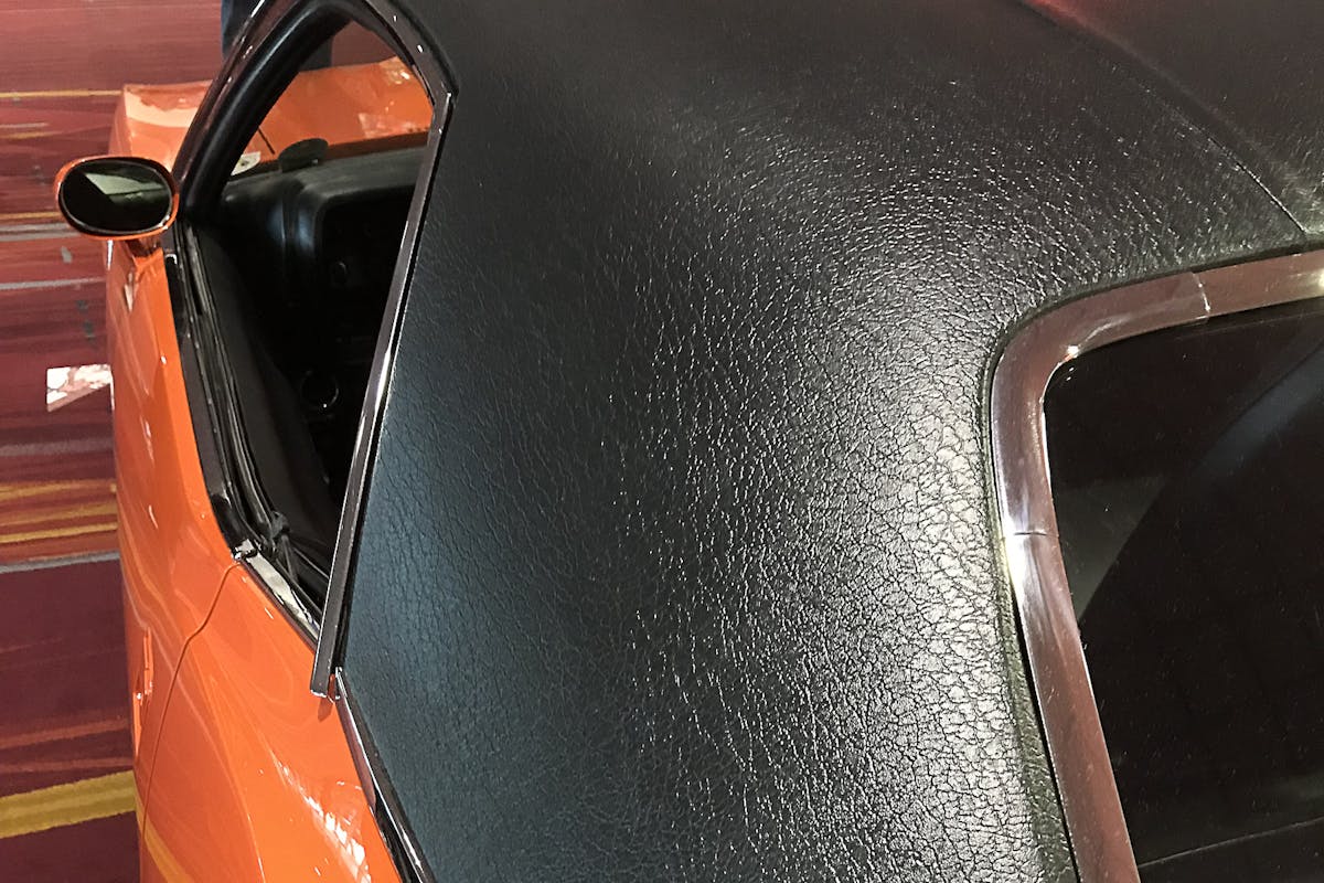 “Your standard landau top is an embossed vinyl outer layer mechanically bonded to a polyester non-woven backing. You can think of the non-woven backing as a soft fuzzy felt-like material. It’s basically the same material that’s on the back of car bras,” Hollenbeck says.