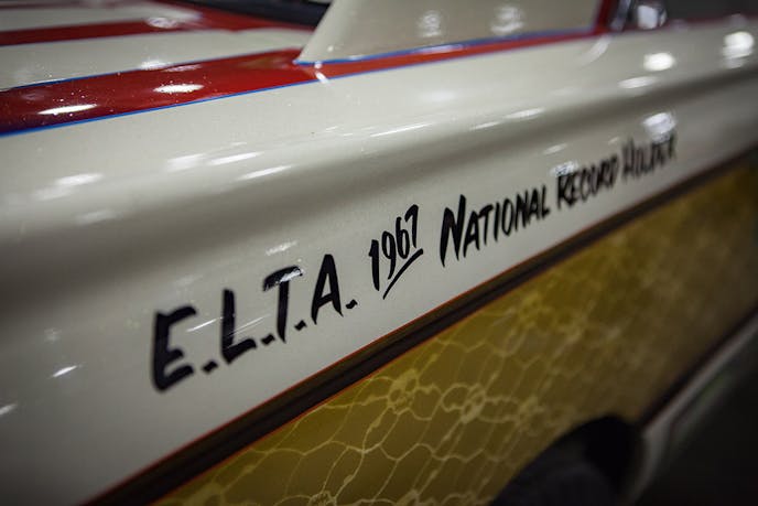 The Ontario-built 355ci small-block Chevy engine that Glenn installed remains, but the intake set up has been changed. When Glenn had the car, he ran a unique Edlebrock X-C8 dual quad crossram intake manifold with two Holley carbs side by side.