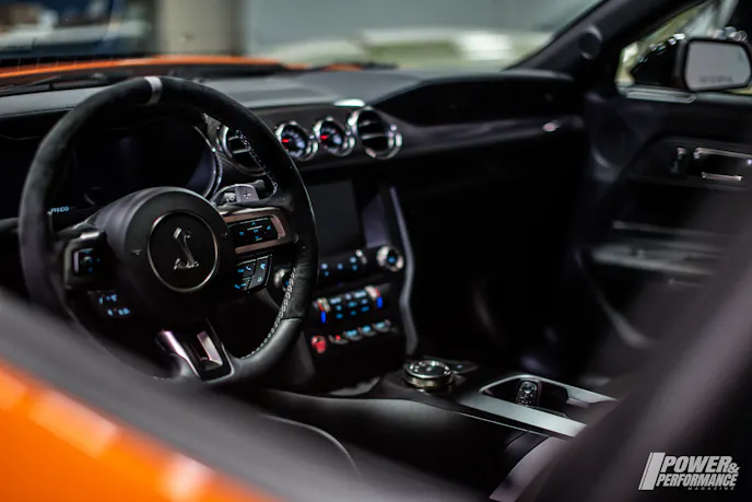 The GT500 comes with two handling packages. The first, includes adjustable strut top mounts and spoiler with Gurney flap. The other, a Carbon Fiber Track Package, comes with exposed 20-inch carbon fiber wheels with 0.5-inch-wider rear wheels (11.5-inch), adjustable exposed carbon fiber GT4 track wing and splitter wickers with integrated dive plane. The back seat has been deleted to reduce weight.
