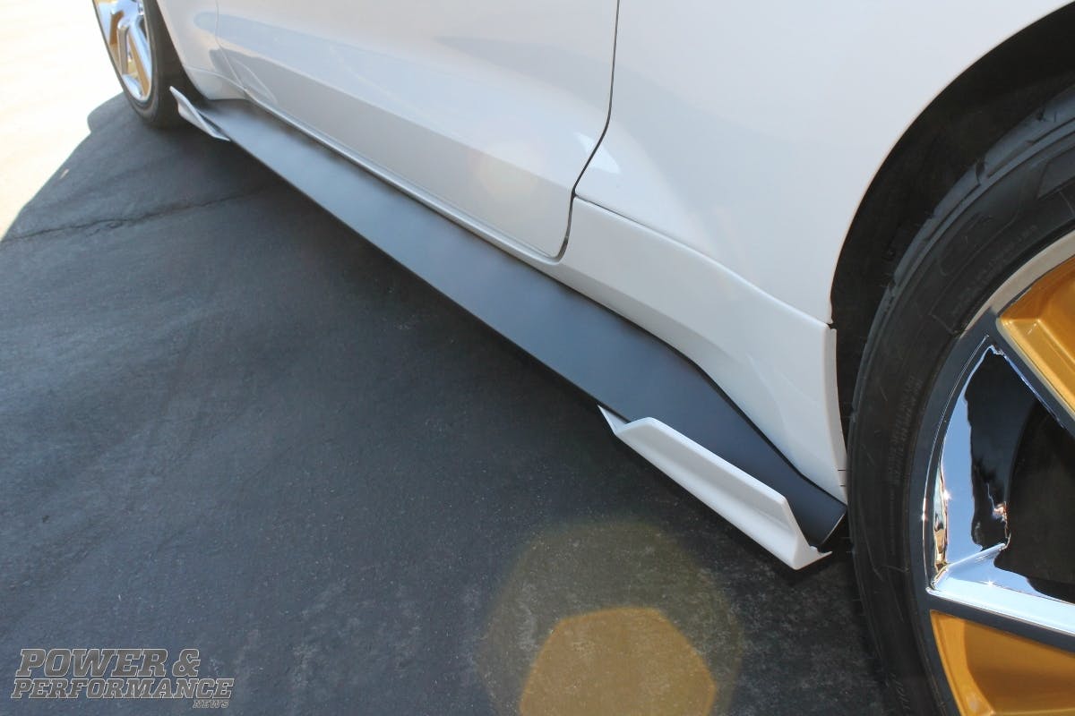 The custom hood has functional twin intake scoops that assist in moving fresh air into the supercharged engine bay. As noted earlier, the hood also gives a slight amount of additional supercharger space underneath, and just for good measure, gas assist shocks hold the hood up – so you can toss that factory hood prop rod in the trash. Side splitters dress each of the rockers, and the rear deck wing adds significant downforce at speed, in addition to delivering terrific appearance merits.