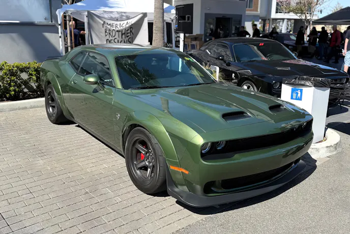 The latter car, the Super Stock, was the highest performance, drag-oriented Challenger offered at the end of the model’s run, save for the Demon 170. The Super Stock was outfitted with an 807-horsepower version of the 6.2-liter supercharged engine from the Hellcat Redeye, drag-tuned suspension, 18-inch lightweight five-spoke wheels mounted with street-legal Nitto NT05R drag radials, and all the special drag features of the Demon, including line-lock, Power Chiller, Race Cool Down, and a Torque Reserve system. This Super Stock looked absolutely splendid in F8 Green, one of my favorite Dodge colors.