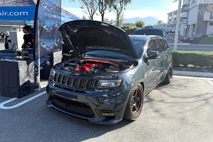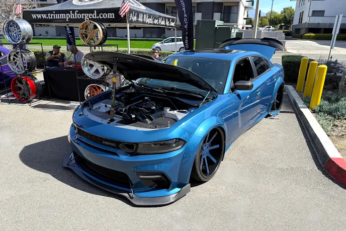 Present was a late model Charger SRT Hellcat draped in a eye-dazzling, red, pink, white, and black “urban camouflage” wrap, a 2023 “Last Call” Chrysler 300 392 HEMI, which, in addition to sporting bespoke gold graphics, was lowered and outfitted with custom wheels and white-letter rubber, and a Jeep Grand Cherokee Trackhawk wrapped or painted in what could best be described as baby aspirin pink. Several more cars, including a slammed Challenger rolling on 24-inch bright red multi-spoke wheels, reminded everyone that Mopar people don’t hold back when they mod their cars.