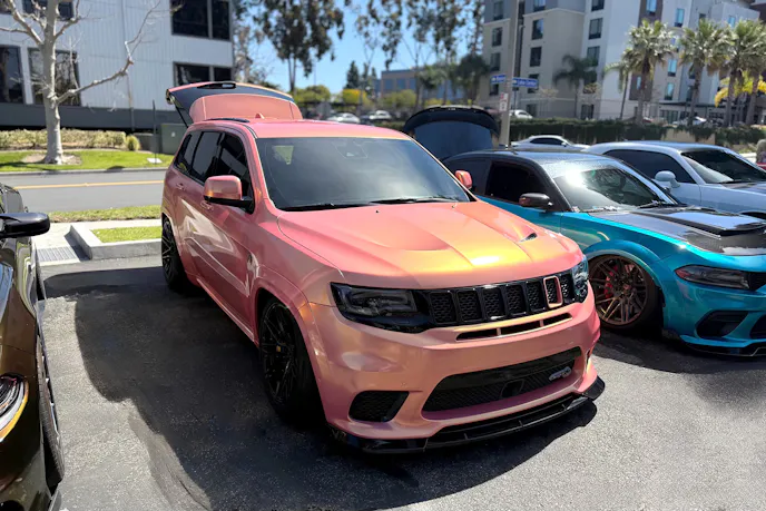 Present was a late model Charger SRT Hellcat draped in a eye-dazzling, red, pink, white, and black “urban camouflage” wrap, a 2023 “Last Call” Chrysler 300 392 HEMI, which, in addition to sporting bespoke gold graphics, was lowered and outfitted with custom wheels and white-letter rubber, and a Jeep Grand Cherokee Trackhawk wrapped or painted in what could best be described as baby aspirin pink. Several more cars, including a slammed Challenger rolling on 24-inch bright red multi-spoke wheels, reminded everyone that Mopar people don’t hold back when they mod their cars.