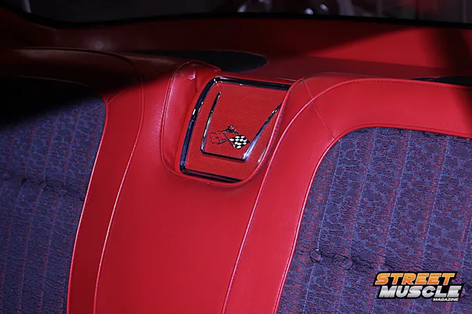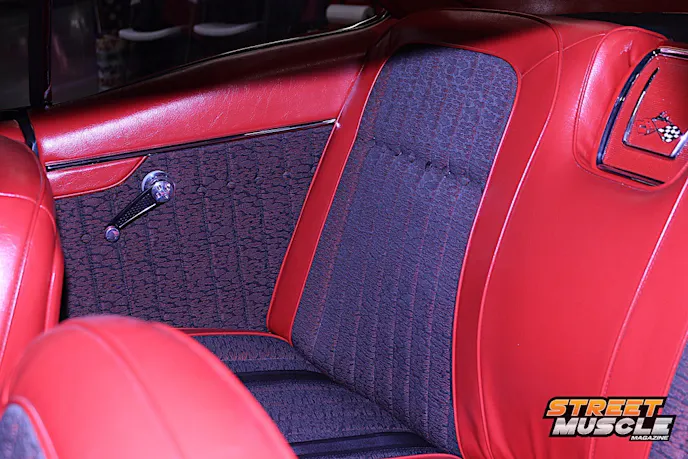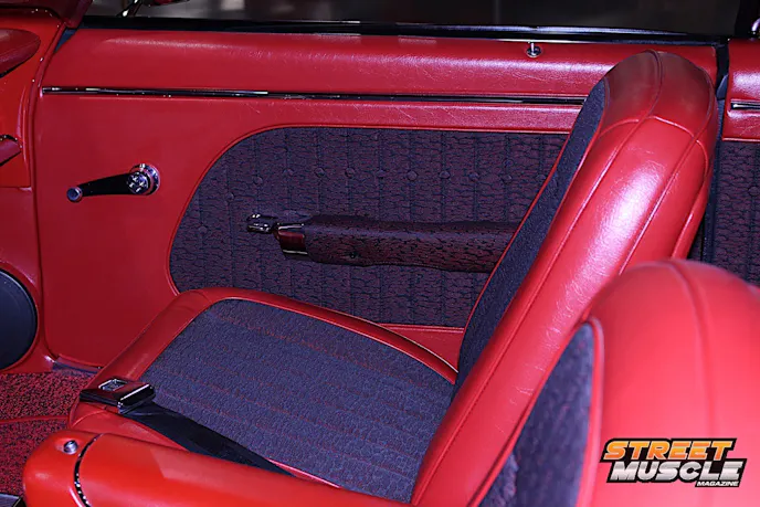 Open the doors, and you’ll find red cloud pattern fabric used in 1957 Chevys with custom upholstery throughout. The seats, front and rear, are similar to what you’d find in an early Impala, with the center rear speaker like they had back in the day.