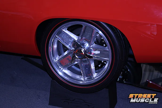 Putting the Z409 Camaro to the pavement is done with a set of custom knock-off wheels by EVOD Industries, using Corvette knock-off nuts. The wheels are wrapped with Nitto Invo Pro tires, modified by Diamond Back with the nostalgic red stripe.