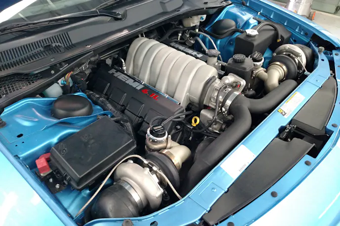 You could forgive car show attendees for dismissing the car as a tuned Charger at a glance, but something about the execution of the fabricated front splitter indicated to me that there was more going on here than just a few run-of-the-mill bolt-ons. A peek under the hood confirmed my suspicions – a twin turbo setup the likes of which I hadn’t seen before on a modern Hemi car. That alone I felt was worth digging deeper – why go turbo when supercharging is a much easier path with late-model Mopars, one which is far better supported by the aftermarket?