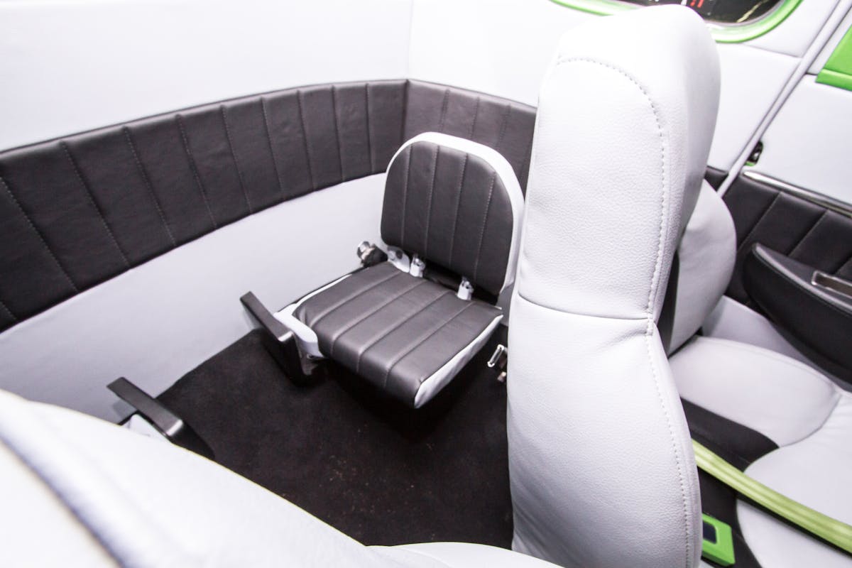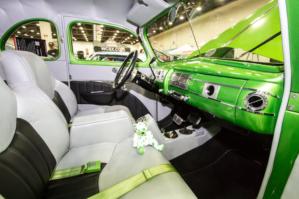 The custom interior is accented with things like green seat belts and a matching stuffed animal.