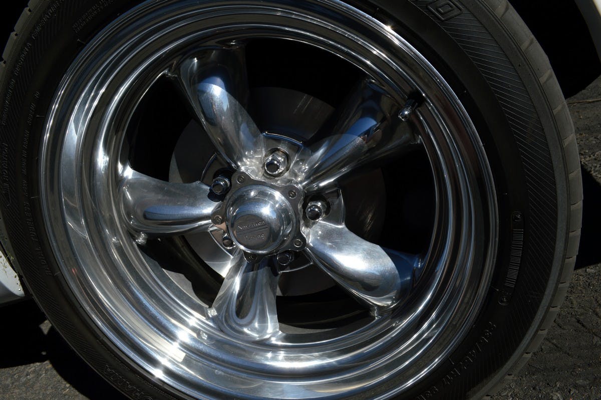 Planting the Mustang to the pavement are polished 17×8-inch American Racing Torq Thrust II wheels wrapped in 235/45/ZR17 Yokohama rubber.