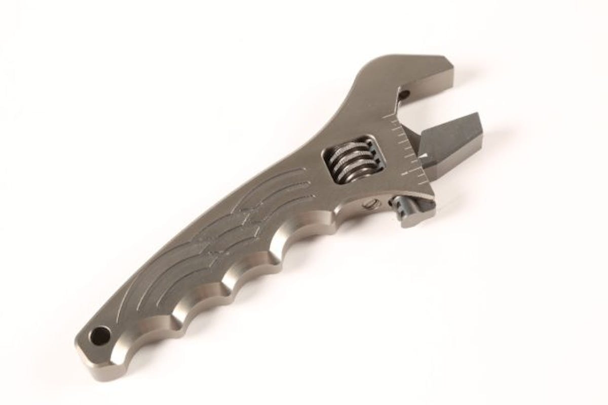 Manufactured from high-quality aluminum, this adjustable wrench boasts a V-groove opening, which allows for superior grip on a variety of fittings, a grooved handle that helps prevent over tightening and a unique composite design that helps prevent damage to the finish of aluminum hose ends and fittings. Keep your work precise and clean while taking advantage of the versatility of a good, adjustable AN wrench.