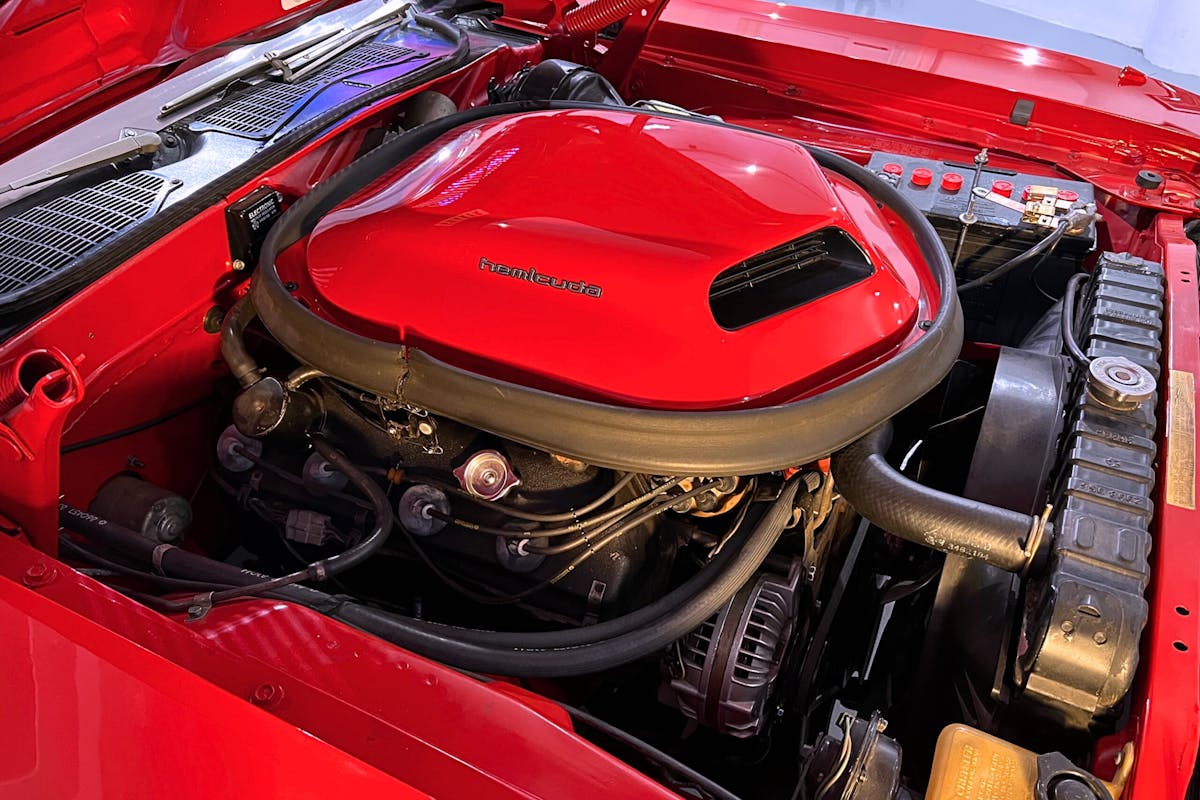 Which brings us to ’70 ’Cuda number two. Like the Hemicuda, it is slathered in Rallye Red, with Elasomeric front and rear bumpers, a Shaker hood, black vinyl top and interior. Power comes from a date-code correct 440 6-bbl. The four-speed and rear are the original pieces.