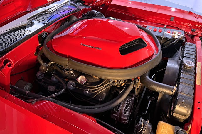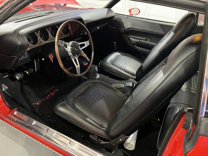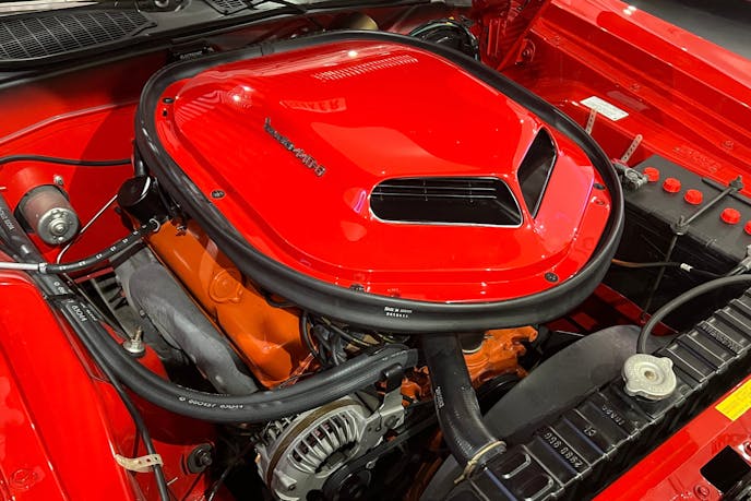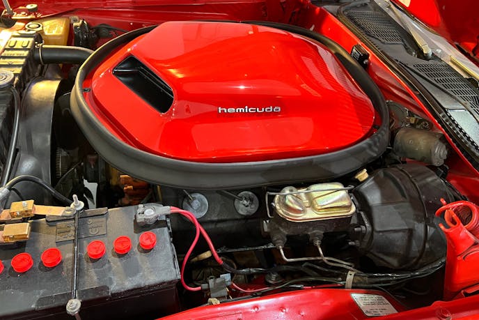 Which brings us to ’70 ’Cuda number two. Like the Hemicuda, it is slathered in Rallye Red, with Elasomeric front and rear bumpers, a Shaker hood, black vinyl top and interior. Power comes from a date-code correct 440 6-bbl. The four-speed and rear are the original pieces.