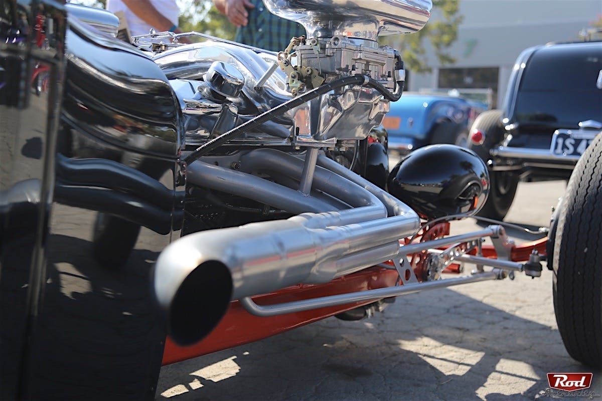 A 9-inch Ford rearend helps put power to the pavement, filled with 28-spline axles and a  3.0:1 gear ratio,and a set of Aldan coilover shocks are mated with a triangulated four-link. In order to keep the Roadster’s freakishly low stance, it was fitted with a 1934 Ford axle, coupled with quarter-elliptic leaf springs and custom fabricated hairpins. All of this is brought together via a 1967 Dodge 727 TorqueFlite automatic transmission with manual shift that slams through gears with an authoritative punch courtesy of a B&M shifter. Providing adequate stopping power is a combination set-up of Ford rear drums and eight-inch General Motors discs up front. The Roadster sits on 15-inch American Racing Torq-Thrust five-spoke wheels wrapped with Firestone rubber in the front and slicks in the rear.