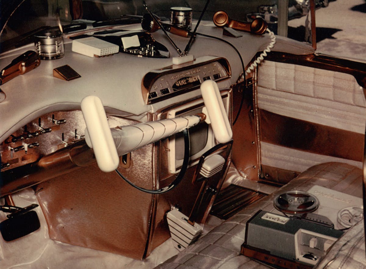 More gold plating was ladled on the the sides of the fenders, and the car was fitted with new twin-V tail fins and bumperettes. Jim Rote was brought into the mix to design an electronic control system for the car that would allow for a plethora of steering options, including manual or standard (the steering wheel for which was completely removable—column and all), pushbutton steering on both the driver and passenger side, and a centered, aircraft like “uni-control” lever that could also regulate acceleration and braking.