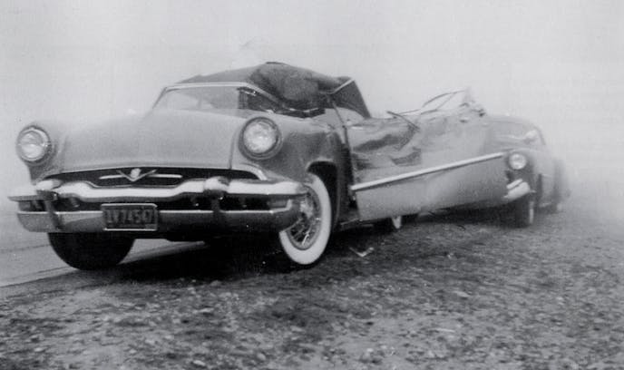 Barris recounted the story in an interview with Jonnie King in his “Hall of Fame Legends” series. “I was towing a guy’s car back because he blew the engine, and we just bumpered it together and back over to Ridge Route—that’s all we had, we didn’t have trailers in those days,” he explained. “Regretfully, we slid under a hay truck with it, and we came out of it alright, but the hay truck bed went over the top and peeled the top off, so the rest of the car was good, but the top was gone.”