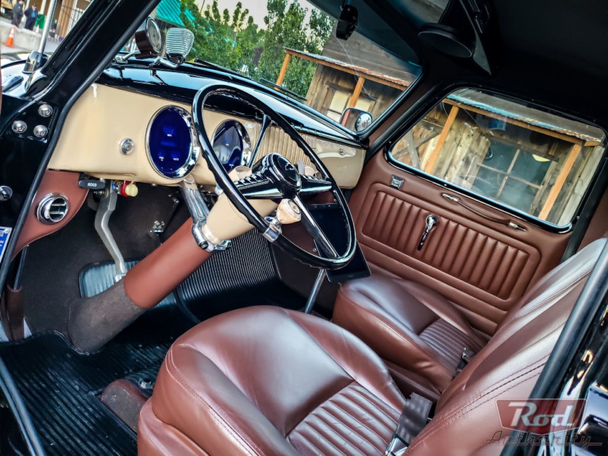The old ’54 Chevy cockpit has been treated to a thoughtful rethink. Swathed in chocolate leather and loaded will all modern amenities. Dakota Digital supplied the gauges and JVC/Pioneer provides the tunes. In addition, it has power windows, heated seats, and three rearview cameras. Be sure and check out the vintage restored Chevy steering wheel, one of our all-time favorite tiller designs.