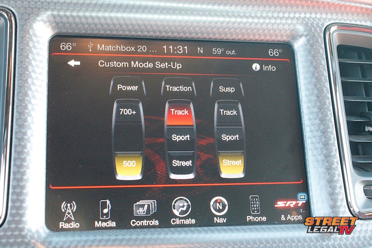 The navigation system is one of the cooler luxuries to the Hellcat. Having never driven a car with navigation, it was amazing to watch the screen change and give us precise directions and instructions. When we approached a turnoff, the screen displayed a graphic of the current freeway that let us know we could use either of the three right lanes to exit, and then it reverted back to the map display. Navigation isn’t new, but it was a nice feature to have and was well used during a couple of our trips.