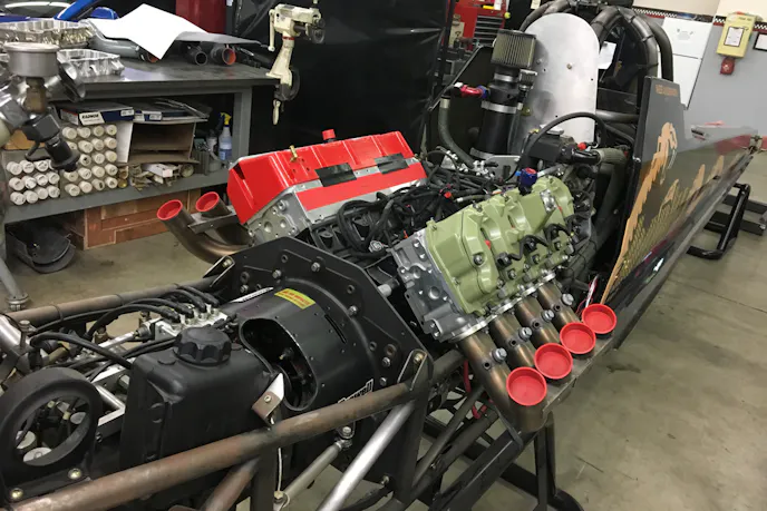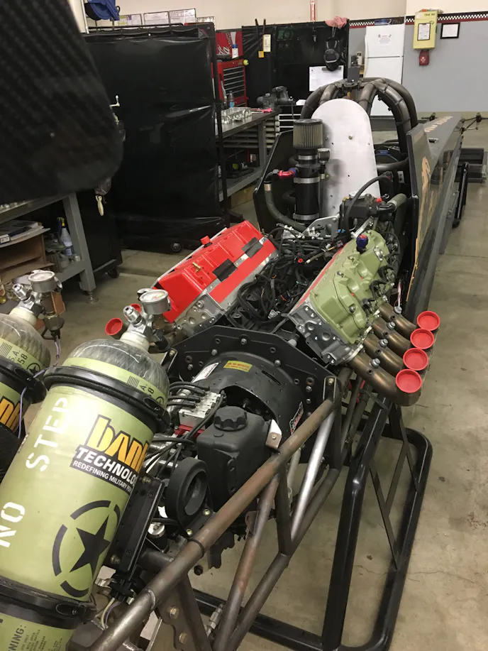 Throughout the campus, we saw Camaros and Mustangs, we saw some military vehicles, and we saw lots and lots of engines, primarily GM diesel engines. Some were in crates, some on stands, and one was going into this dragster that you see here. We were intrigued, a diesel dragster? Of course, and we just had to ask about it.
