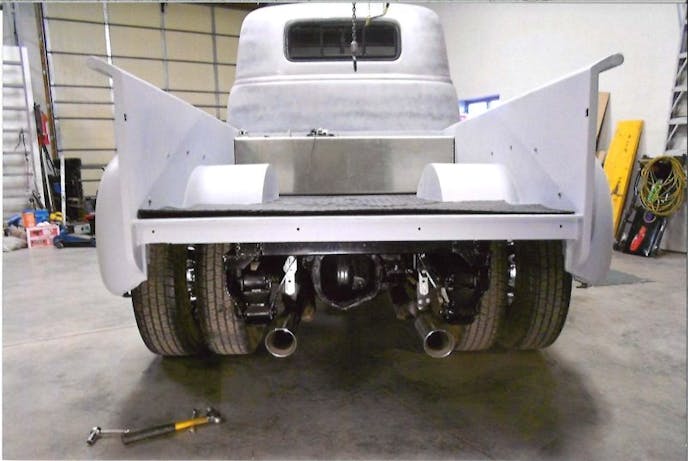 Next Dan went looking for a donor car –well, OK, another truck! He found a perfectly good 2013 Chevy one ton with a 6.0 engine and 6-speed automatic in Abilene, Texas. It had been wrecked but had less than 10K miles on it so he purchased it. The dually rearend came out of that same truck to be installed on his COE frame, except, Dan narrowed it 14-inches to fit under the bed he planned to make later.