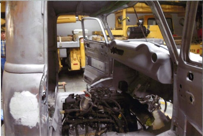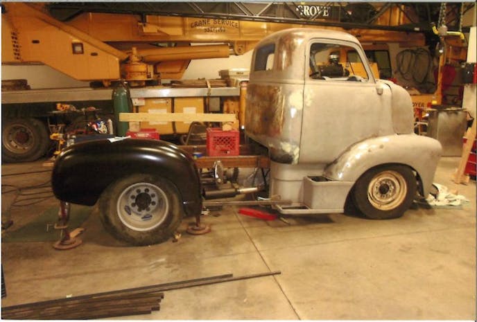 Back around to the front of the COE, the front wheel wells have been modified so they don’t look so large for the smaller tires Dan chose to run up front. A stock pick-up front bumper will also be used below the newly chromed stock grille. Dan has plans to paint the truck silver with a red leather interior.