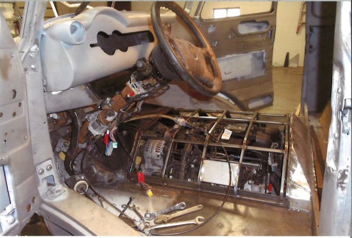 His plan was to use a wider frame in order to install and remove the engine from underneath, instead of trying to install (and remove it if necessary) thru the doors. He purchased a Dodge motor home front stub and mated it to 3×5-inch rectangular tubing. He moved the engine rearward 18-inches while building motor mounts so it sets inside the cab and the seat will sit atop it. But by doing that, the oil pan sits so low Dan had to build a skid plate so it wouldn’t hit asphalt bumps while he motors down the highway.