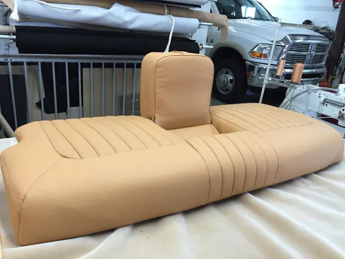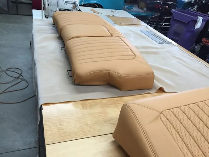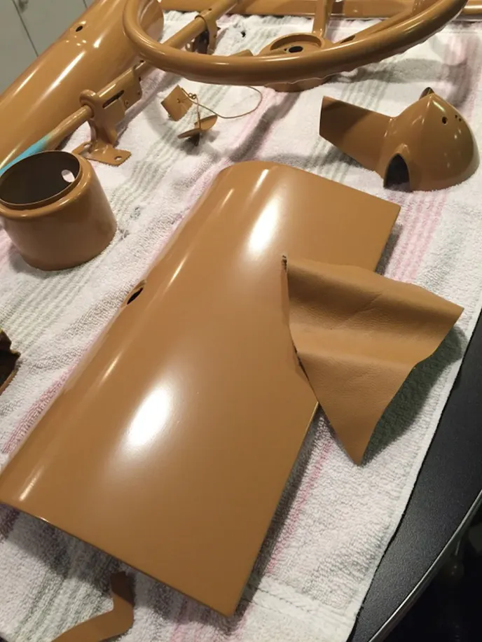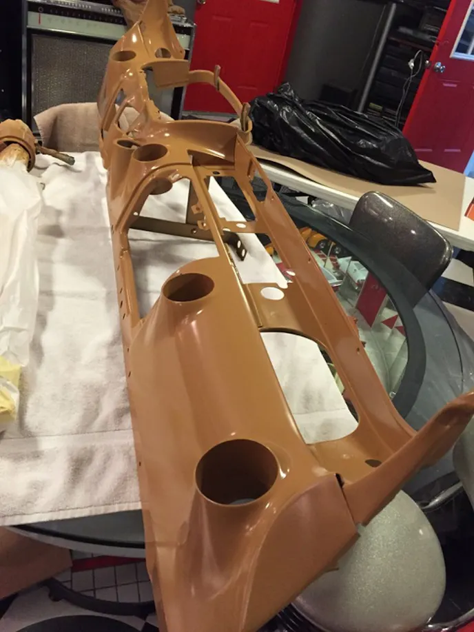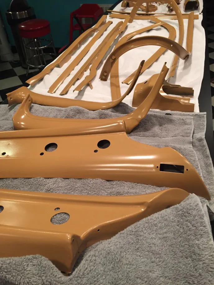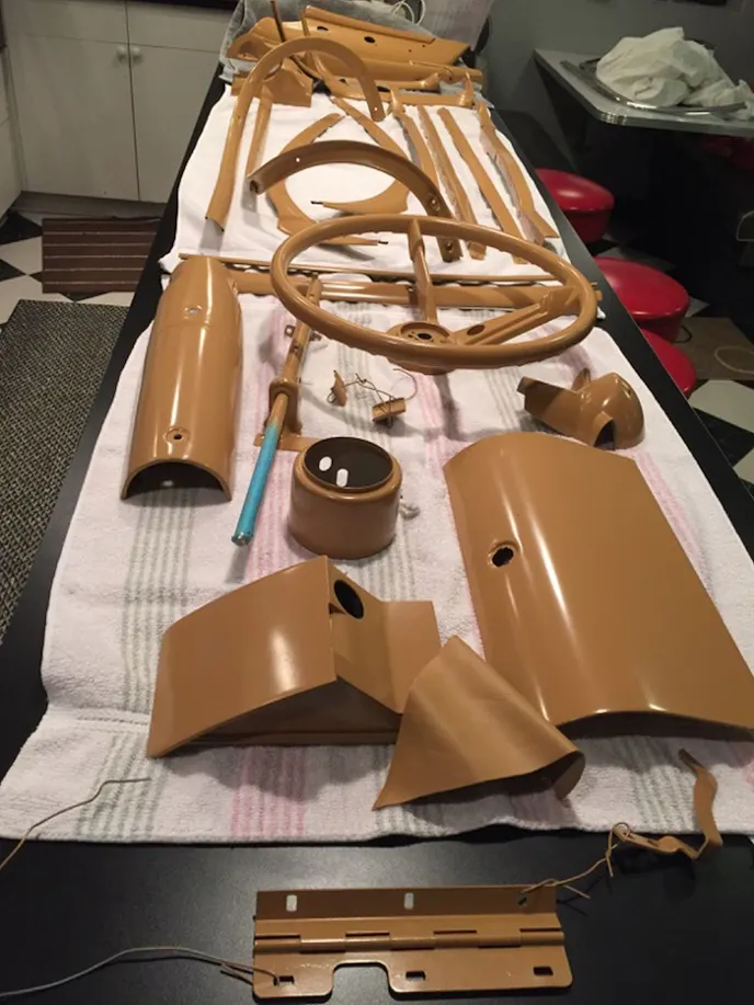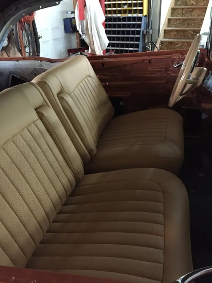 Over the course of six years, the Cadillac did get worked on, but only in spurts – the ’56 got a rebuilt 500ci and a new 700 R-4 transmission and the ’57 Chevy showed up. Body work was completed one summer and the ’34 Plymouth sedan was purchased. The Cad got a Butterscotch Dreamsicle water-based paint job by Wicked Custom Classics of Castle Rock, Colorado, in the Spring of 2012, and the ’62 Impala re-do was put in front of the Cadillac. Assembly of the front clip and wiring on the Caddy followed in the Fall and over a few more months, a late model split bench seat was fitted in the Cadillac; and trunk upholstery completed. About that time, the relative gave up on the El Camino and Ron got it. Of course, that was only a minor ‘bump’ and eventually, in 2014, the only thing left to do on the Cadillac was A/C, wiring, stereo, headliner, rear seat, and the rest of the interior and glass.