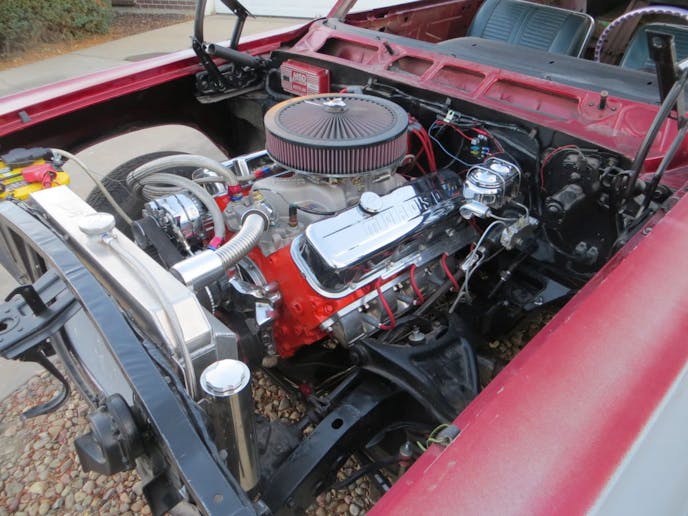 In October, 2016, Chuck Kumalaa in Ohio put up an ad wanting to trade his partially built ’63 Impala for something, anything, to drive summer, 2017. I contacted Chuck, conversation ensued and pictures went back and forth. He loved the Willys, said it was the right color – orange, his favorite, and we chatted via phone. Thru-out the conversation it was learned he’d built the car over a six year period and had yet to drive it because it wasn’t finished. Dan and I give credit to Chuck for the majority of the build on the ’63. He had the 427” big block engine built and added a brand new M21 four-speed and a 3:55 Posi. The engine currently has less than 100 miles on it.