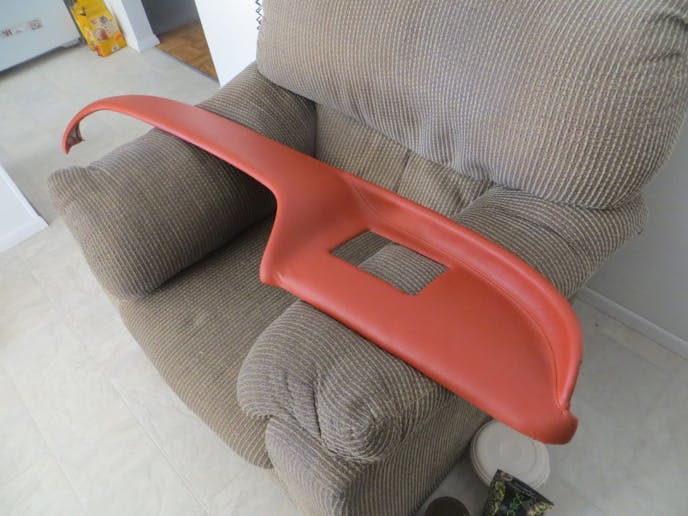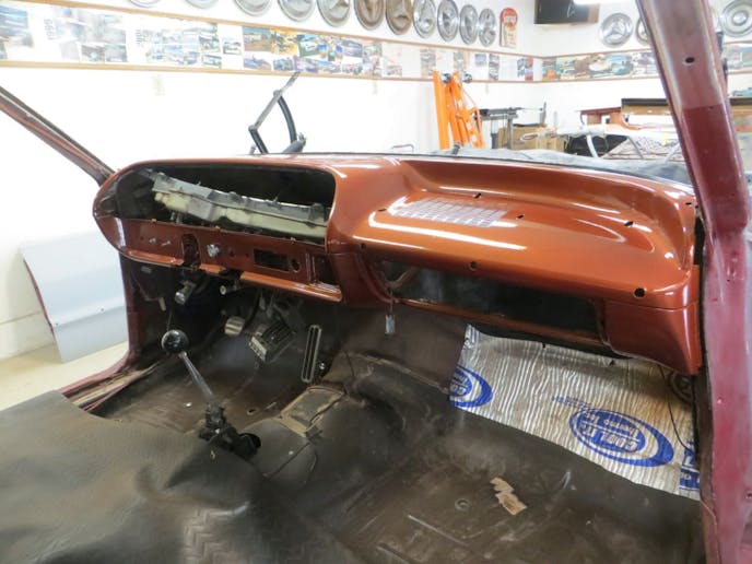 We were worried the hood wouldn’t fit since the big block had a riser manifold, 4-barrel carb and K& N filter. After adjusting the hood, we found it had 3/8-inch of clearance. The dash was next –not a fan of the factory black, it was sanded and painted the first of the two-tone colors we had picked out –Hyundai Copper Beige. Neither Dan or I are a fan of factory stock, so the two SS consoles that came with the car went up for sale – a new one would be built. The doors were next –removed, old primer blocked and re-primed. In the process red was removed from the jambs, sealed and painted the second color they chose – Chrysler Mango-Tango.