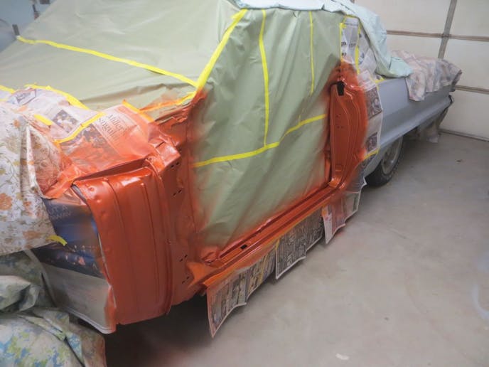 After the doors were hung and adjusted, we tackled the trunk – one of the original rear coves was crooked when the repro quarter was installed. It was cut out and replaced with a new cove. The driver’s side was replaced as well. Since the trunk had been replaced, the floor was scuffed and new spackle paint was sprayed, now it looks new. The trunk lid was blocked, re-primed, adjusted and the roof was blocked and re-primed after that. The Impala’s quarters were primed and the car guide-coated. The car is to be painted by a good friend, Dave Pareso of Back Street Kustoms in Fountain, Colorado.