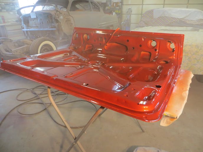 The first thing they did after unloading the car was sand the red paint off (I’mnot a fan of red). Then we pulled the primered fenders, blocked the old primer, re-primed them, painted the inner panels and put ‘em back on. The repro grille was installed next and headlights and doors. The old primer on the hood was blocked, re-primed, the underside painted black and bolted on.