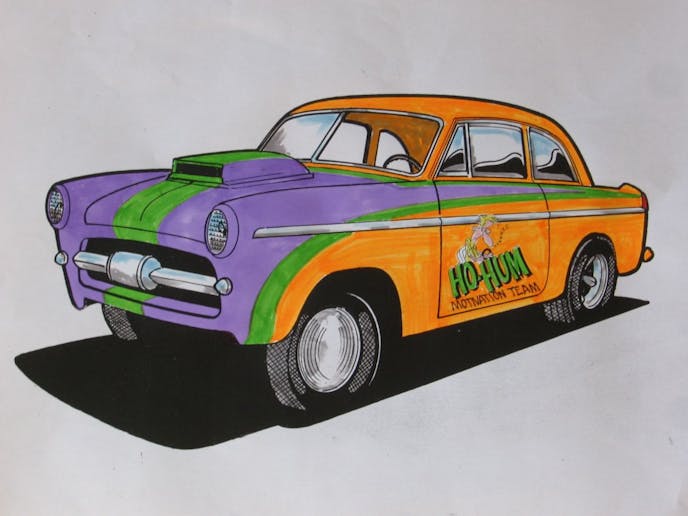 The ’63 Impala was an opportunity that knocked…we had built a ‘52 Willys as a Lark, just to see what we could do with a vehicle like that. So me, being an artist, illustrated the car as a ‘gasser,’ including the wild paint job.