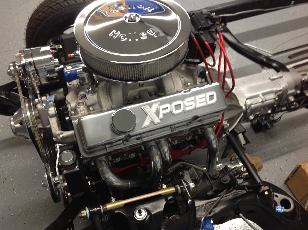While Carl was hard at work on the body, Tony focused on the chassis and interior. Tony replaced two rotted areas on the chassis and detailed it before sending it to Advanced Powder Coating in Wasilla, Alaska. The standard small-block 327ci Chevrolet engine was replaced by something with a little more go-power: a 383 stroker engine that puts out an impressive 486-horsepower and 375 lb-ft of torque at 6,000 rpm. Tony says, “I wanted raw power to go with the bare metal.”