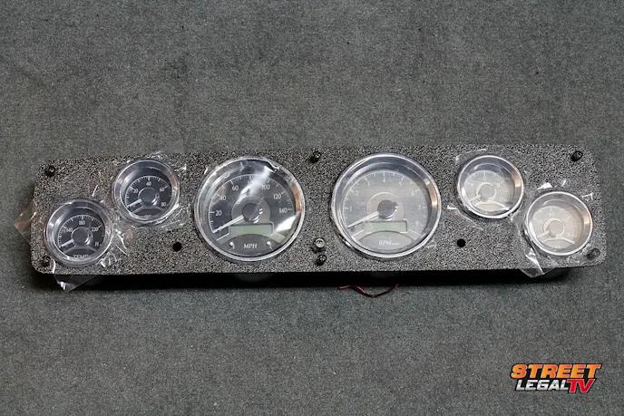 Since the Dakota Digital VHX-1050 and VHX-1060 are designed to the same sizes as typical 5- and 6-gauge sets, we already had half the battle won because we had already made a template from cardboard, and made a custom-cut ABS plastic gauge panel. The new gauges simply fit in place of the others, so very little work was needed to mount them.