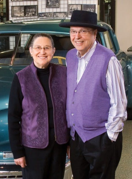 Speedy Bill and Joyce pose in front of one of the many #4X Speedway Motors house cars.