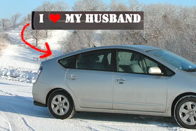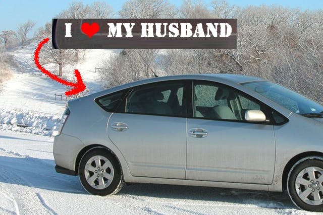 8. It snowed, so I can’t drive my musclecar and have to drive the wife’s econocar to work with her “I [heart] my husband” bumper sticker I forgot to tape over.