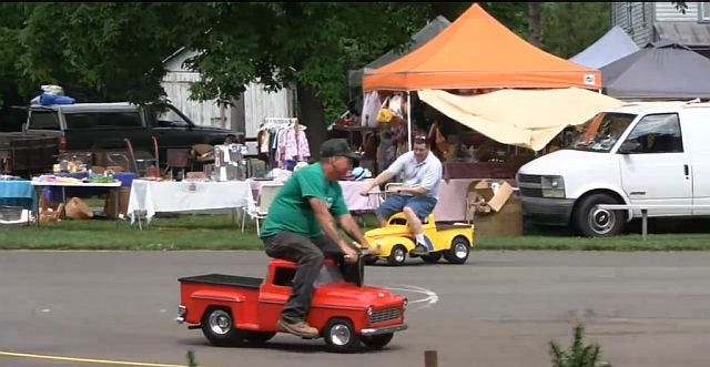 805ROADKING has uploaded a video that will bring out the inner boy in any man. While attending a swap meet in a small town in Pennsylvania (judging from his accent and the Amish in the video), he witnessed a group of men having the time of their lives. He saw them driving around miniature cars, lookin’ like kids playing after school.