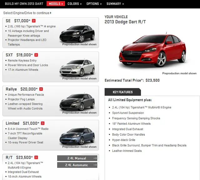 Other tidbits on the configurator reveal the option of HID headlights, an integrated dual exhaust, and 18-inch wheels on the R/T models. Rumor has it that Dodge is already working on a 300+ horsepower SRT version of the Dart, though the compact will launch with three engines ranging from 160 to 184 horsepower. But will that be enough to compete in this competitive compact car market?