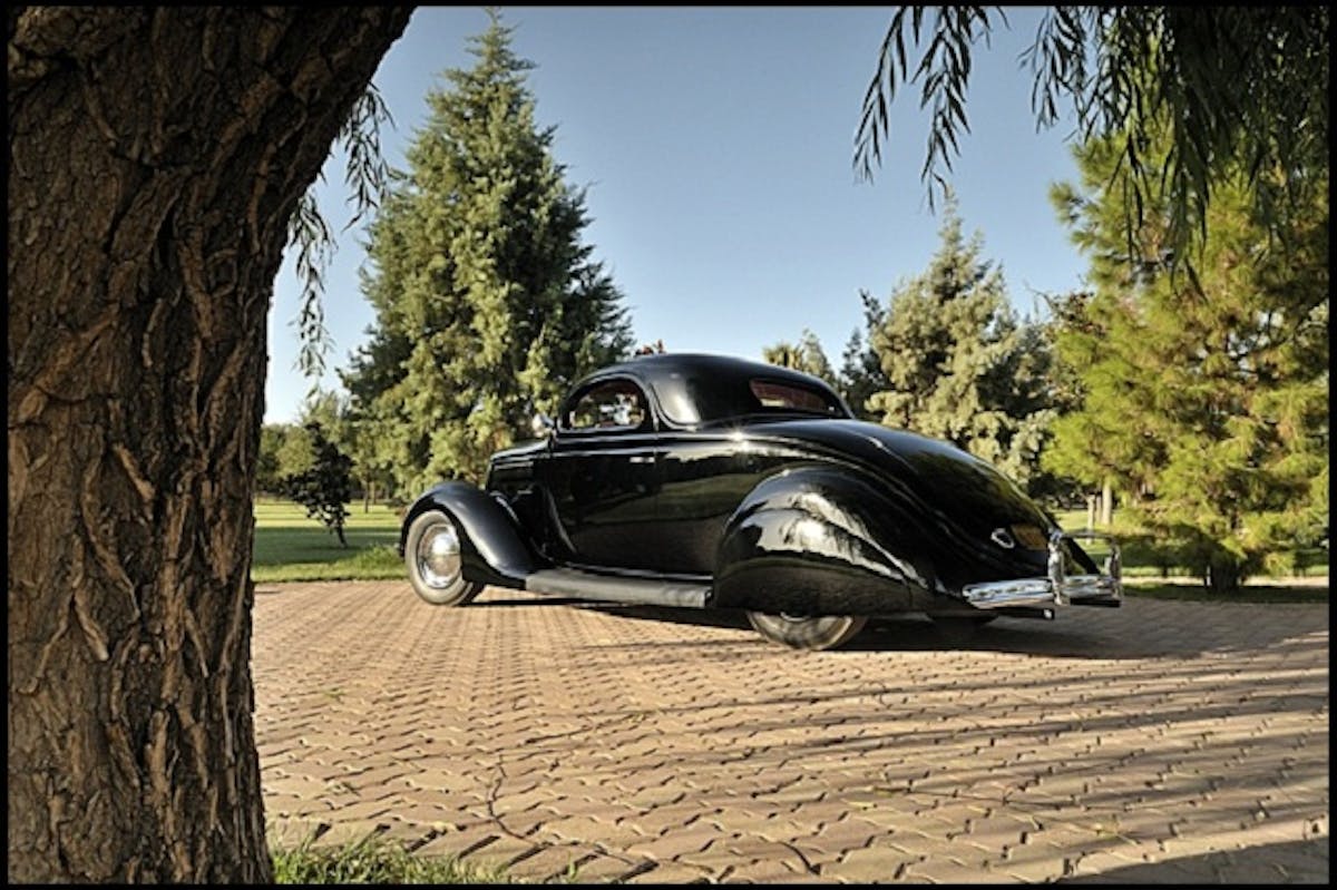 Purchased from the original owner in 1947, the 1936 three-window was originally intended to tow Calori’s hot rod race car. But it wasn’t long before local handyman and Calori’s friend Herb Reneau convinced the avid racer to give his new “tow vehicle” the custom treatment. What resulted was known as the Jack Calori Coupe, a custom hot rod with a Z’d frame in the rear, drop front axle, 3-inch chop, 1939 LaSalle front grill, Buick teardrop fender skirts and 1940 molded Chevy headlights.